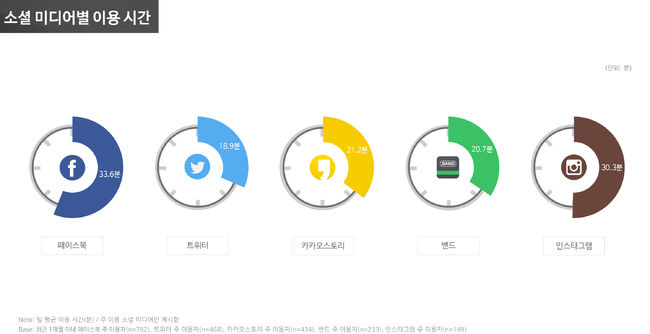 광고마케팅 플랫폼 기업 DMC미디어가 지난 5일 발표한 ‘2016 소셜 미디어 이용 행태 및 소셜 미디어 광고 접촉 태도 분석 보고서(만 19세~59세 남녀 800명 표본조사)’에 따르면 최근 1개월 이내 소셜 미디어 이용경험이 있는 응답자 중 페이스북 주 이용자의 일 평균 이용 시간이 33.6분으로 가장 길었다. 다음으로 인스타그램(30.3분), 카카오스토리(21.2분), 밴드(20.7분), 트위터(18.9분) 순으로 확인됐다.