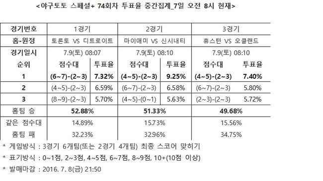 체육진흥투표권 스포츠토토의 수탁사업자인 ㈜케이토토(www.ktoto.co.kr)는 오는 9일(토)에 열리는 미국프로야구(MLB) 3경기를 대상으로 한 야구토토 스페셜+ 74회차 투표율을 중간 집계한 결과, 토론토-디트로이트(1경기)전에서 토론토의 승리를 예상했다고 밝혔다.