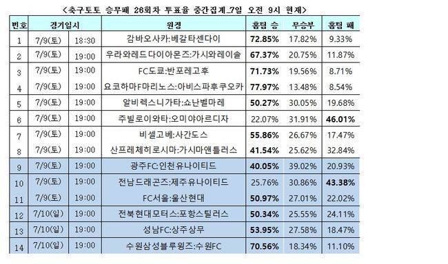 체육진흥투표권 스포츠토토의 수탁사업자인 케이토토(www.ktoto.co.kr)가 오는 9일(토)과 10일(일)까지 벌어지는 국내프로축구 K리그 클래식 6경기와 일본프로축구 J리그 8경기 등 총 14경기를 대상으로 한 축구토토 승무패 26회차를 발행한다.