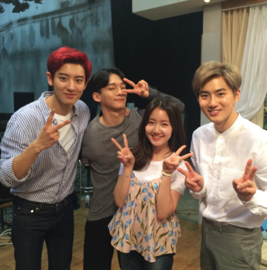 공개된 사진 속에는 진지희가 그룹 EXO의 찬열, 첸, 수호 사이에서 행복한 미소로 손가락 브이를 그리고 있다. EXO 멤버들도 각자 부드러운 미소를 띠고 훈훈한 미모를 뽐냈다.