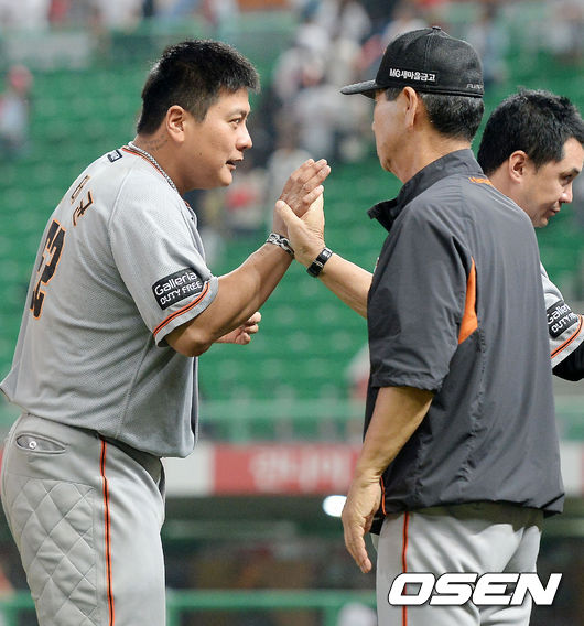 경기를 마치고 한화 김태균이 김성근 감독과 하이파이브를 하고 있다. / rumi@osen.co.kr