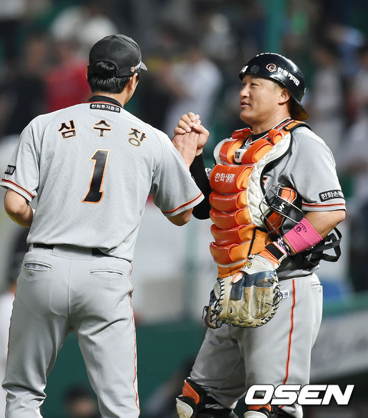 경기를 마치고 한화 심수창과 조인성이 하이파이브를 하고 있다. / rumi@osen.co.kr
