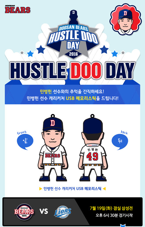 ‘허슬두데이’는 두산을 대표하는 스타 선수를 활용해 팬들과의 커뮤니케이션 활동을 활성화하고, 이를 통해 팬들의 사랑에 보답하고자 기획한 스타 마케팅 전략이다. 아울러 올 시즌 ‘허슬두데이’는 ‘HUSTLE DOO MEMORY’라는 컨셉으로 스타 선수와의 추억을 담을 수 있는 USB 메모리 스틱을 증정하는 것으로 기획했다.