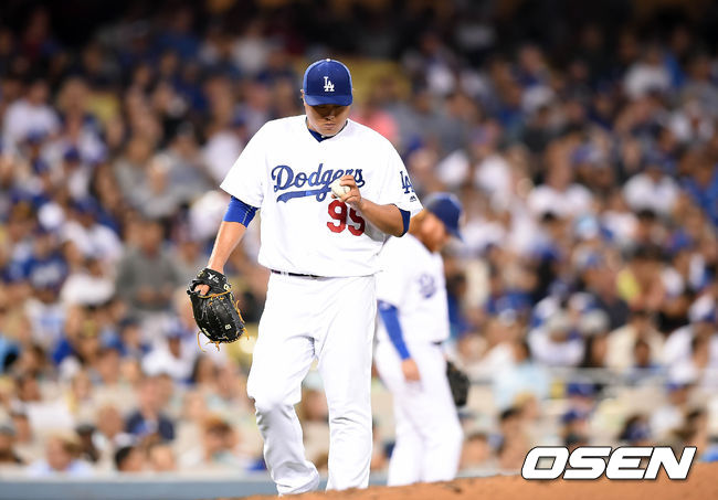 8일(한국 시각) 미국 캘리포니아주 로스앤젤레스 다저스타디움에서 열린 '2016 메이저리그' LA 다저스와 샌디에이고 파드리스의 경기, 다저스 류현진이 4회초 추가실점을 한 후 아쉬워 하고 있다.
