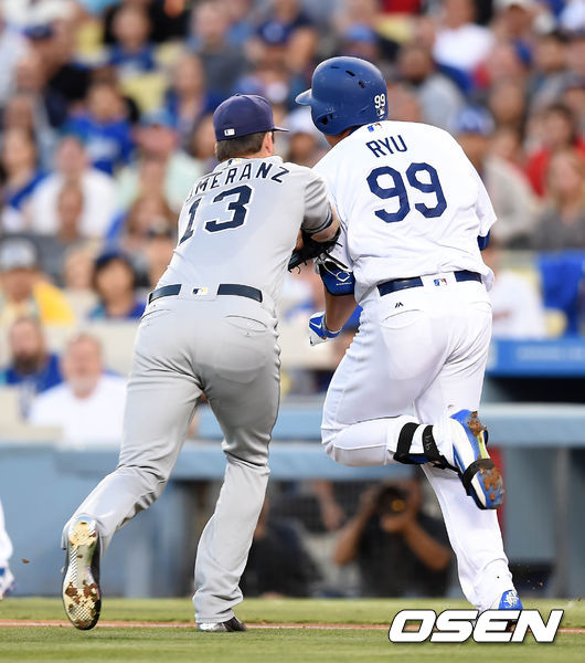 1회 샌디에이고 1번 멜빈 업튼 주니어에게 중월 솔로 홈런을 맞고 시작한 류현진은 2회 안타와 볼넷으로 1사 1·2루 위기에 몰렸다. 8번 라이언 쉼프를 커브로 헛스윙 삼진 잡고 한숨 돌렸지만 9번타자로 들어선 투수 포머란츠에게 의외의 일격을 당했다.