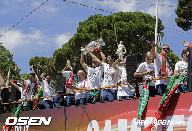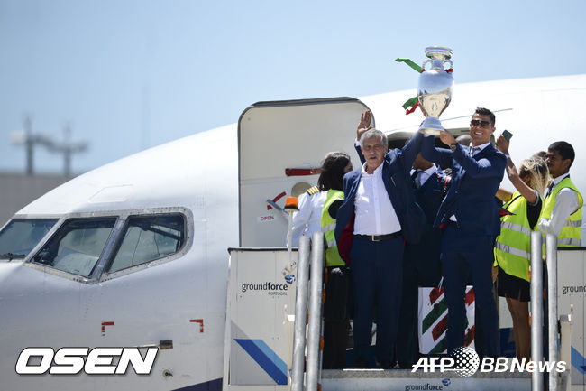 포르투갈 선수들은 12일 수도 리스본에 입성했다. 선수단을 태운 전용기가 공항에 착륙하자 포르투갈을 상징하는 자주색과 초록색 물기둥이 맞았다. 포르투갈의 정재계 인사들이 직접 공항까지 배웅을 가서 선수들을 맞이했다. 비행기 문을 활짝 연 호날두는 트로피를 높이 치켜올렸다.