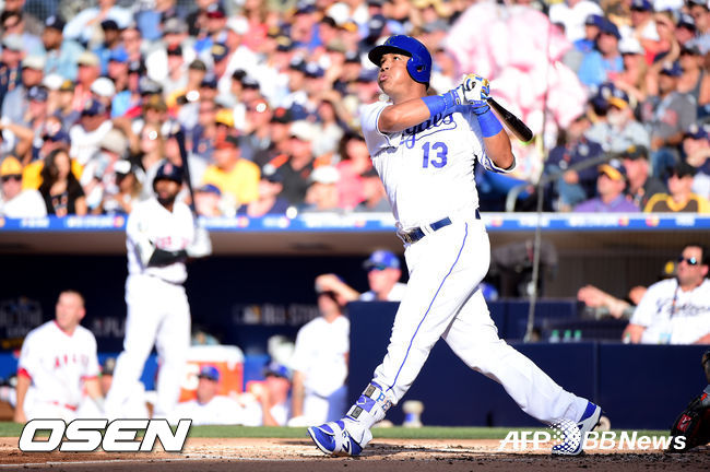 아메리칸리그 올스타 살바도르 페레즈(캔자스시티 로열스)가 13일(한국시간) 미국 캘리포니아주 샌디에이고 펫코 파크에서 열린 '제87회 올스타전' 1-1로 맞선 2회말 1사 1루에서 좌월 투런 홈런을 터뜨렸다.
