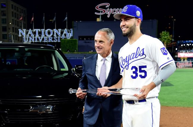 [사진] 롭 만프레드 커미셔너(왼쪽)가 13일 미국 캘리포니아주 샌디에이고 펫코파크에서 열린 2016 올스타전 MVP로 뽑힌 에릭 호스머(캔자스시티)에게 트로피를 전달하고 있다. ⓒAFPBBNews = News1(무단전재 및 재배포 금지)