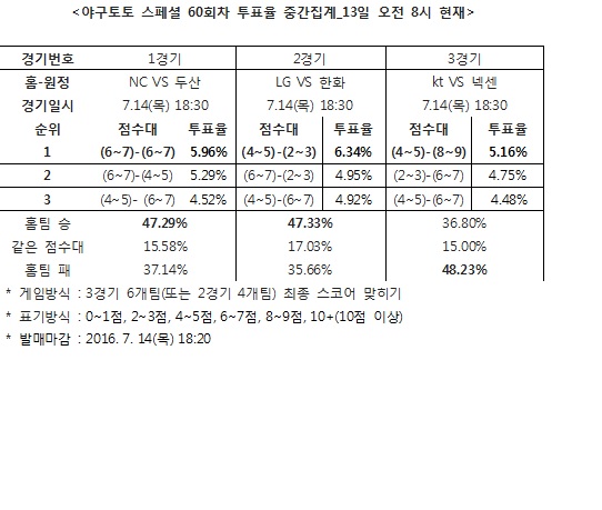 한편, 주중에 벌어지는 국내프로야구 3경기를 대상으로 하는 야구토토 스페셜 60회차 게임은 오는 14일 오후 6시 20분에 발매가 마감되며, 경기가 모두 종료된 이후에 적중결과가 공식 발표된다.