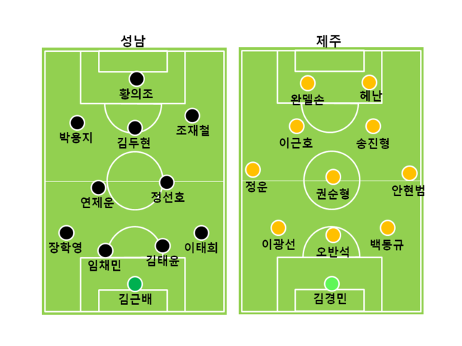 이에 맞서는 제주는 캡틴 오반석이 부상에서 복귀해 스리백의 중심을 잡았다. 새 외국인 공격수 완델손과 헤난이 투톱으로 나섰고, 이근호 송진형 등이 지원 사격했다. 제주는 5경기(1무 4패) 연속 무승 늪에서 탈출하는 게 시급한 과제였다.