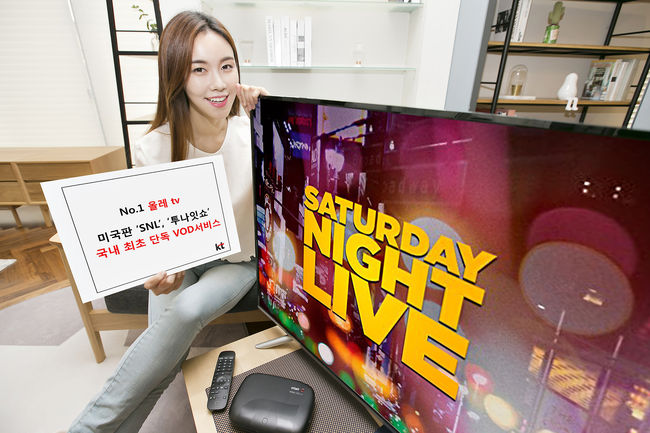 KT는 자사 IPTV 서비스 올레 tv가 미국 인기 코미디 쇼 ‘SNL(Saturday Night Live∙ 새터데이 나잇 라이브)’과 토크쇼 ‘지미 펠론의 투나잇 쇼(The Tonight Show starring Jimmy Fallon)’의 주문형비디오(VOD)를 국내 최초로 단독 서비스 한다고 밝혔다.