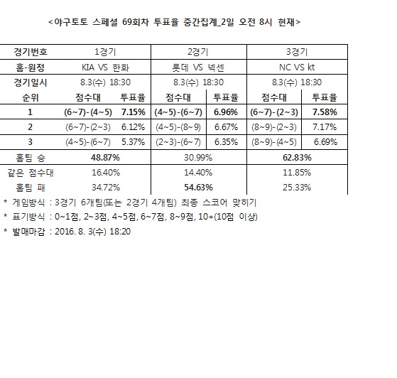 KBO 3경기 대상 야구토토 스페셜 69회차 투표율 중간집계