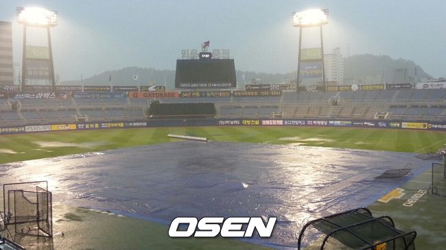 이날 마산구장에는 오후 4시가 지난 후 소나기가 퍼붓기 시작해 순식간에 그라운드는 물바다로 변했다. 마산구장 관리직원과 NC 직원들이 대형 방수포로 내야를 덮었으나, 파울 지역과 외야 곳곳에는 물웅덩이가 생겼다. 소나기와 함께 번개까지 내려쳤다.