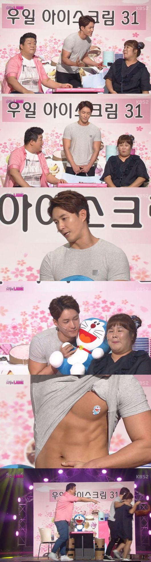 7일 방송된 KBS '개그콘서트-사랑이 LARGE'에 배우 심형탁이 출연했다. 이 코너는 먹을 것을 밝히는 연인 김민경과 유민상이 먹을 것을 놓고 투닥거리는 코너다. 이날도 두 사람은 아이스크림을 놓고 투닥거렸다. 보통 사람들이 먹는 통이 아닌, 매장에 파는 통째로 시켜 먹으려 한 것.