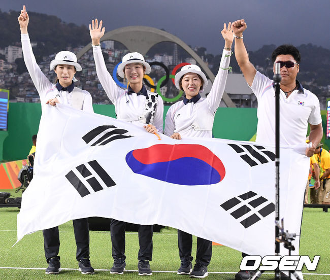 '신궁' 여자양궁이 올림픽 8연패의 대업을 달성했다. 한국은 7일(이하 한국시간) 브라질 리우 삼보드로모 경기장서 열린 여자양궁 단체전 결승전에서 러시아를 세트스코어 5-1 (58-49, 55-51, 51-51)로 물리치고 올림픽 8연패에 성공했다. 이로써 리우올림픽에서만 두 번째 금메달을 선사한 양궁은 진정한 효자종목으로 등극했다. 기보배, 최미선, 장혜진이 기뻐하고 있다. /sunday@osen.co.kr사진=한국온라인사진기자협회 공동취재단