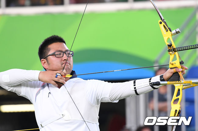 김우진은 8일(이하 한국시간) 브라질 리우데자네이루 삼보드로무 경기장에서 열린 양궁 남자 개인 64강전에서 개빈 서덜랜드(짐바브웨)를 6-0(27-22 28-26 28-25)으로 물리쳤다.