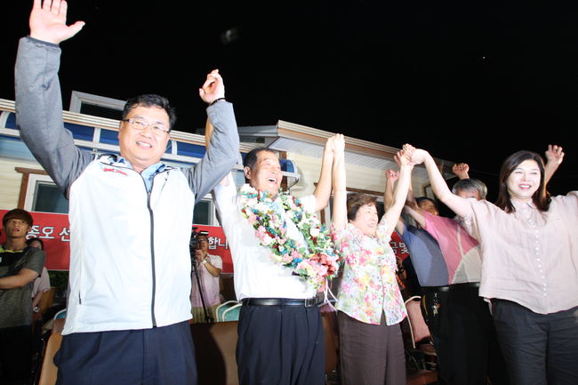 [사진] 진종오의 금메달 획득이 확정되자, 아버지 진재호씨(왼쪽 두번째)와 어머니 박숙자씨(왼쪽 세번째), KT 사격단 임종택 단장(왼쪽 끝)이 환호하는 모습. KT 제공