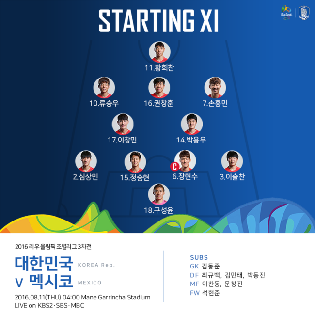 신태용 감독이 이끄는 올림픽 축구대표팀은 11일 오전 4시(한국시간) 브라질 브라질리아 마네 가린샤 스타디움서 멕시코와 2016 리우데자네이루 올림픽 남자 축구 조별리그 C조 3차전을 치른다.