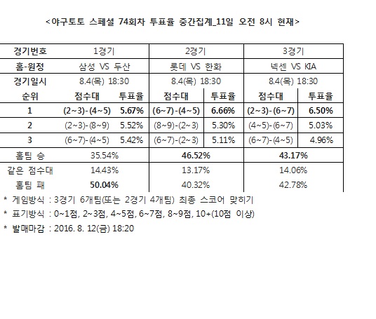 한편, 주중에 벌어지는 국내프로야구 3경기를 대상으로 하는 야구토토 스페셜 74회차 게임은 오는 12일 오후 6시 20분에 발매가 마감되며, 경기가 모두 종료된 이후에 적중결과가 공식 발표된다.
