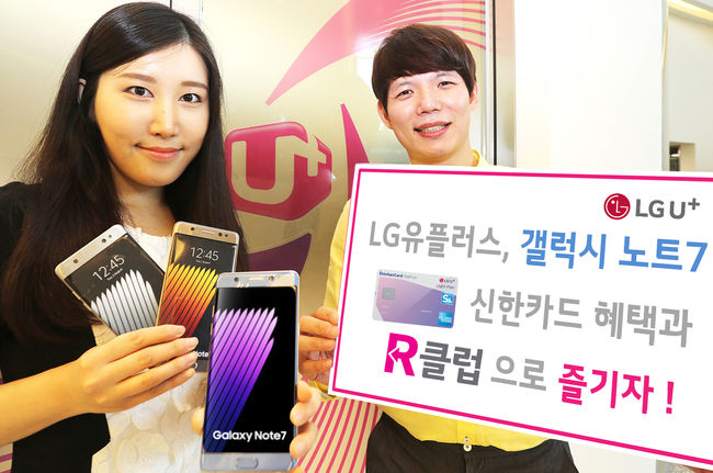 LG유플러스는 신한카드 제휴 프로모션으로 10만 원 추가할인에 기존 R클럽을 활용하는 등 갤럭시 노트7 구매자에게 다양한 혜택을 진행한다고 14일 밝혔다.