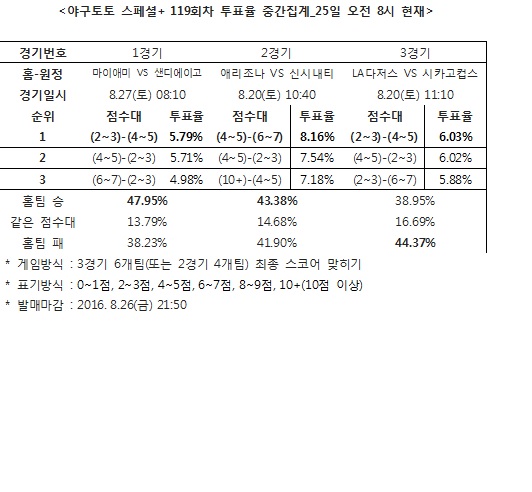 MLB 3경기 대상 야구토토 스페셜+ 119회차 투표율 중간집계