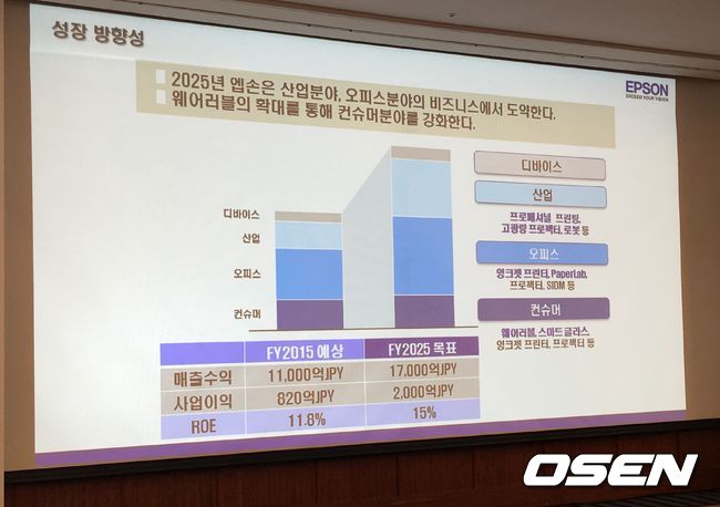 한국엡손은 25일 서울 삼성역 그랜드 인터컨티넨탈 서울 파르나스 호텔에서 열린 한국엡손 설립 20주년 기념 간담회에서 글로벌 기업 비전 '엡손 25'를 발표하고 2025년까지 매출액 1조 7000억엔(약 한화 18조원), 기업이익 2000억엔(약 한화 2조 2000억원), ROS(매출수익률) 12%, ROE(자기자본이익율) 15%를 달성, 글로벌 IT기업으로서의 위치를 굳건히 하겠다고 밝혔다. 엡손은 지난해 매출 1조 1000억엔, 기업이익 820억 엔으로 예상하고 있다.