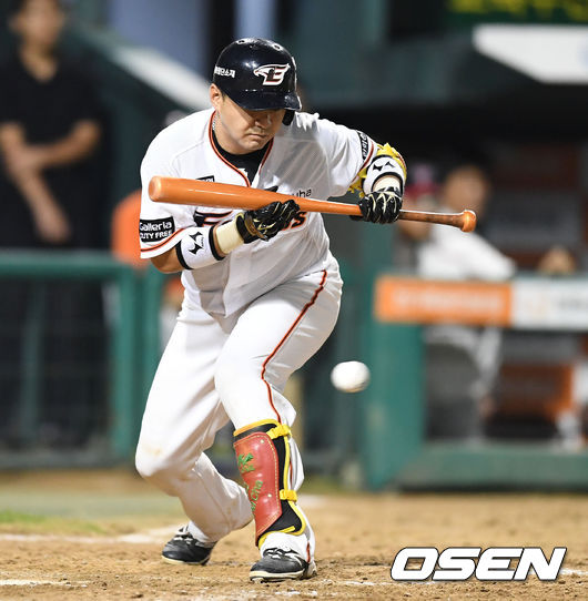 2일 대전 한화-LG전. 한화가 7-6, 한 점차 살얼음 리드를 지키고 있던 8회초 무사 1·2루 찬스에서 차일목이 타석에 들어섰다. 한화 벤치에선 보내기 번트 사인이 났다. LG 내야 수비가 전진하자 차일목은 특유의 페이크번트 슬래시 동작으로 타격 전환했다. 타이밍이 조금 맞지 않아 백네트 쪽 파울.