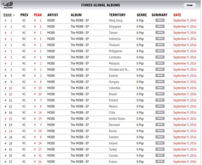 ‘9일 0시 공개된 ‘MOBB’의 더블 타이틀 곡 ‘빨리 전화해’와 ‘붐벼’가 담긴 앨범이 9일 오후 1시 기준 아이튠즈 앨범차트 7개국 1위를 달성하며, 꾸준히 상승세를 기록하고 있다. 특히 힙합의 본고장인 미국 앨범 차트 19위를 기록, 상위권에 이름을 올려 의미를 더했다.