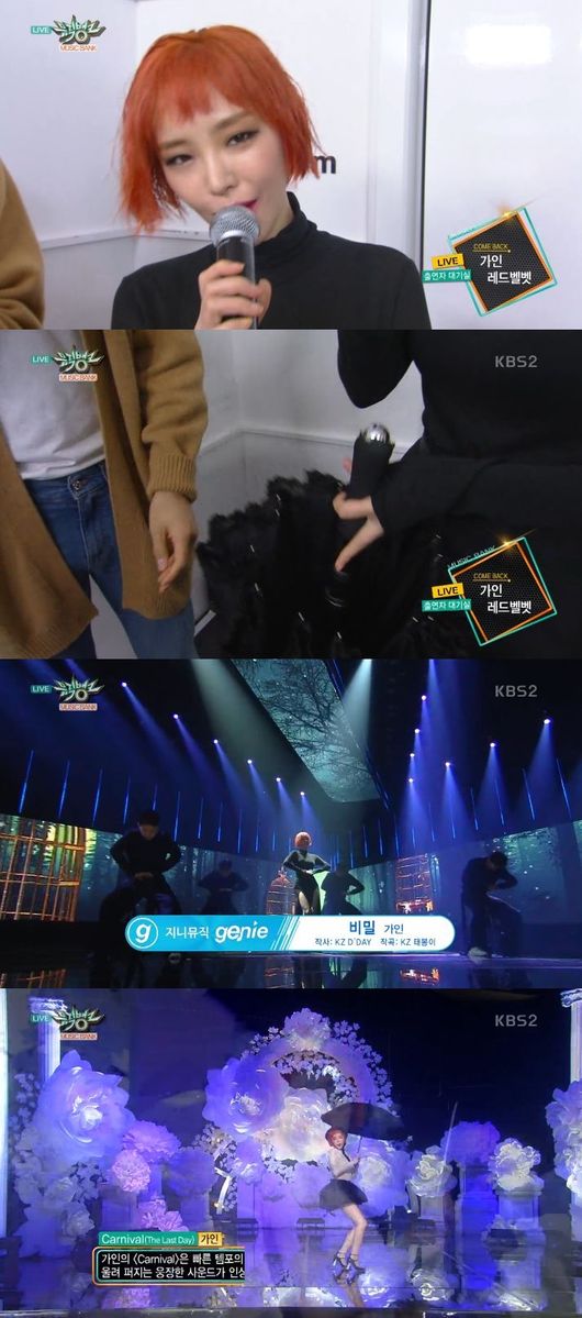 가인은 9일 방송된 KBS 2TV ‘뮤직뱅크’에서 1년 6개월 만의 첫 솔로 앨범 타이틀곡 ‘카니발’과 수록곡 ‘비밀’로 컴백 무대를 꾸몄다.