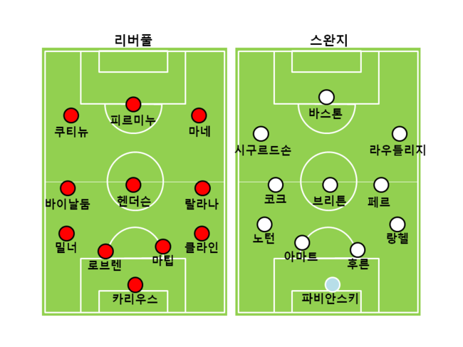 스완지가 기선을 제압했다. 전반 8분 코너킥 찬스서 문전으로 올라온 크로스가 혼전 상황으로 이어졌고, 페르가 골문 앞에서 밀어넣으며 한 걸음 앞섰다. 리버풀은 설상가상 전반 23분 만에 랄라나가 부상으로 빠져 스터리지가 대신 그라운드를 밟았다.