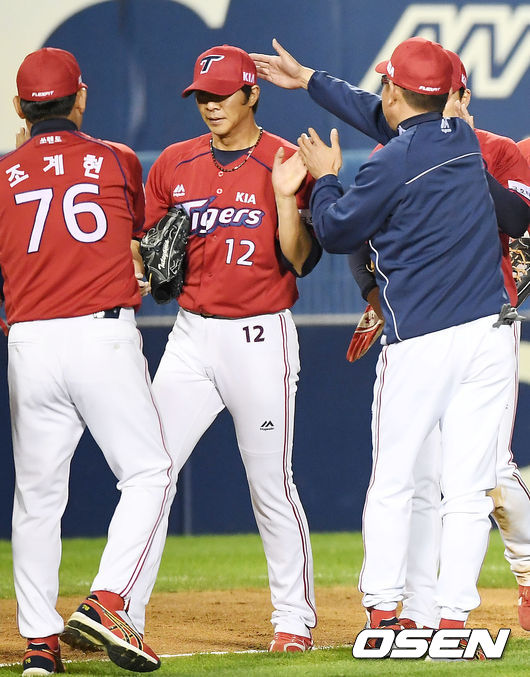 경기를 마치고 KIA 임창용이 김기태 감독과 승리의 기쁨을 나누고 있다./ rumi@osen.co.kr