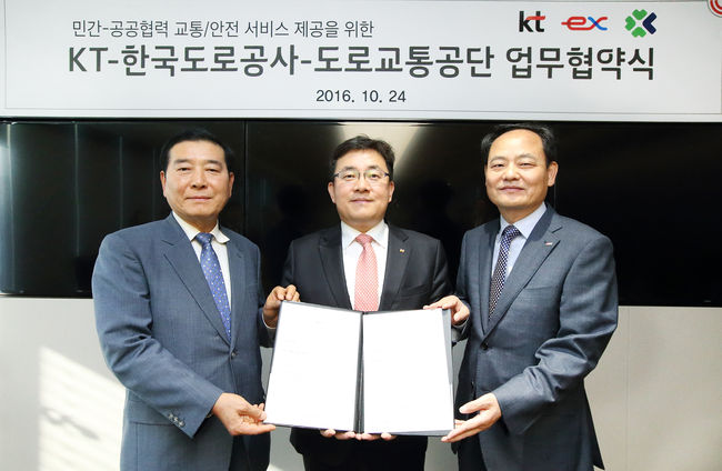 KT는 지난 24일 서울시 종로구 광화문빌딩 이스트 사옥에서 한국도로공사, 도로교통공단과 ‘민관 교통·안전 서비스 개발을 위한 업무협약(MOU)’을 체결했다고 25일 밝혔다.