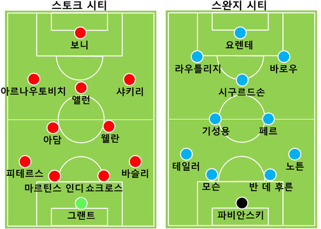 스완지 시티도 예상하지 못한 교체를 했다. 전반 41분 카일 노튼이 다치는 바람에 앙헬 랑헬이 투입됐다. 그러나 스토크 시티와 다르게 노튼의 빈자리는 흔들림의 원인이 됐다. 스완지 시티는 노튼의 공백에 제대로 대응하지 못해 애를 먹는 모습이 나왔다.