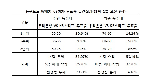 WKBL 우리은행-KB스타즈 대상 농구토토 W매치 62회차 투표율 중간집계 결과