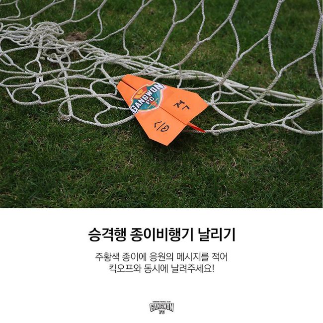 강원FC는 이날 경기서 ‘승격 비행기’ 이벤트를 진행한다. 관중들이 킥오프와 동시에 손수 승리를 염원하는 문구를 써넣은 주황색 종이비행기를 날리는 것이다.