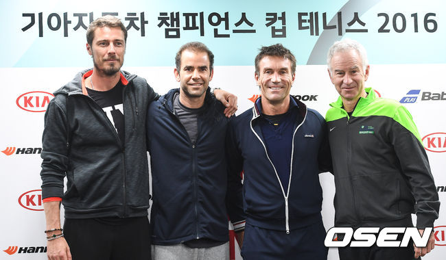 11일 오후 서울 올림픽공원 SK핸드볼경기장에서 진행된 ATP(남자프로테니스) 챔피언스투어 '기아자동차 챔피언스 컵 테니스 2016' 미디어데이 공식기자회견에서 사핀과 샘프라스, 캐시, 매켄로가 포즈를 취하고 있다.