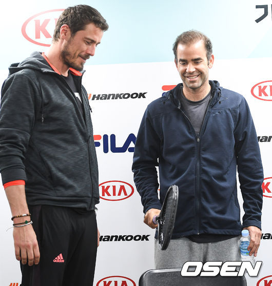 11일 오후 서울 올림픽공원 SK핸드볼경기장에서 진행된 ATP(남자프로테니스) 챔피언스투어 '기아자동차 챔피언스 컵 테니스 2016' 미디어데이 공식기자회견에서 사핀과 샘프라스가 장난을 치고 있다.
