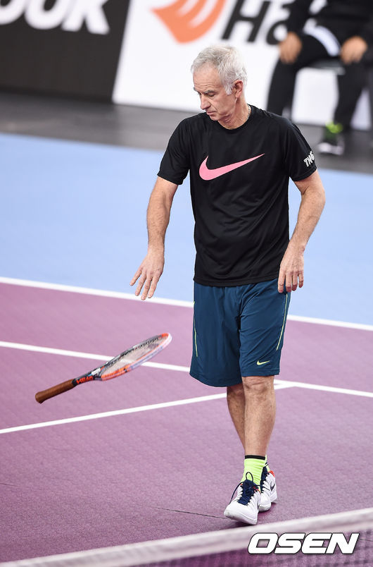 11일 오후 서울 올림픽공원 SK핸드볼경기장에서 진행된 ATP(남자프로테니스) 챔피언스투어 '기아자동차 챔피언스 컵 테니스 2016' 스페셜 오프닝매치 유진선-이형택과 매켄로-사핀 복식경기, 1세트 매켄로가 라켓을 집어던지고 있다.