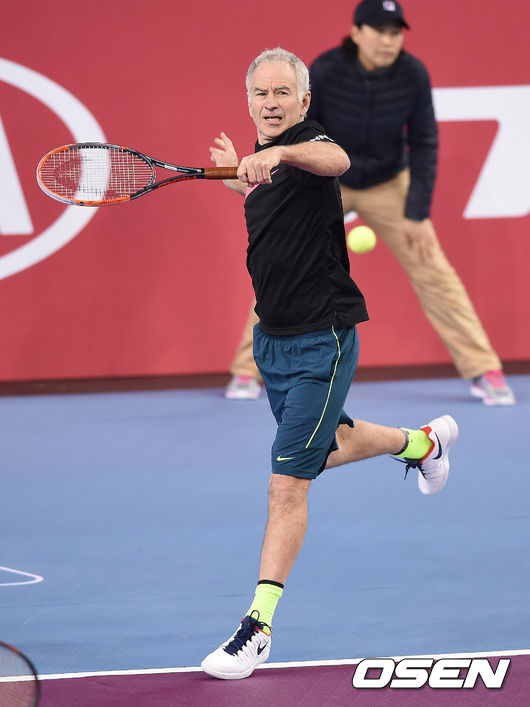 11일 오후 서울 올림픽공원 SK핸드볼경기장에서 진행된 ATP(남자프로테니스) 챔피언스투어 '기아자동차 챔피언스 컵 테니스 2016' 스페셜 오프닝매치 유진선-이형택과 매켄로-사핀 복식경기, 1세트 매켄로가 백스트로크하고 있다.