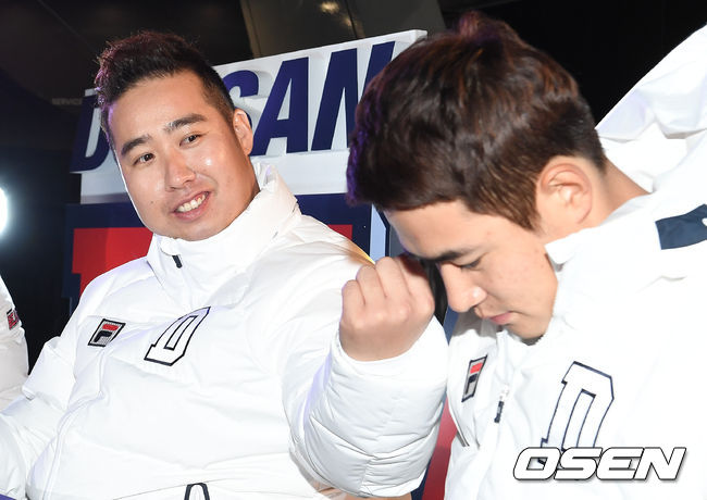 11일 오후 서울 동대문 두타광장에서 진행된 두산베어스가 함께하는 ‘판타스틱 페스티벌’에서 두산 유희관이 김재환을 향해 장난을 치고 있다.