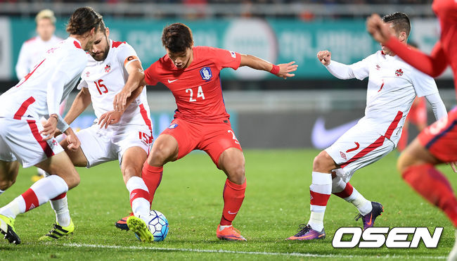 한국은 전반 31분 실점 위기를 넘겼다. 캐나다는 아크 서클 근처에서 얻어낸 프리킥 찬스서 데 용이 사각지대로 향하는 왼발 슈팅으로 연결했지만 권순태가 몸을 던져 막아냈다.