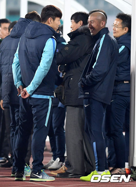 경기 종료 후 한국 차두리 전력분석관이 이정협과 대화를 나누며 미소짓고 있다. /jpnews@osen.co.kr