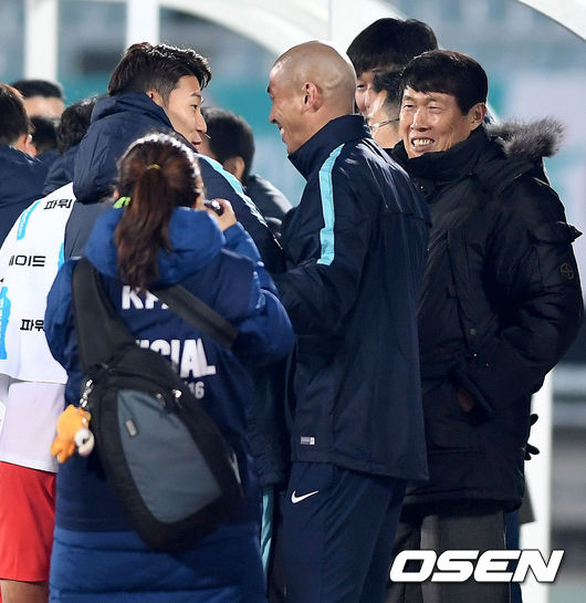 경기 종료 후 한국 차두리 전력분석관과 아버지 차범근이 손흥민과 인사를 나누고 있다. /jpnews@osen.co.kr