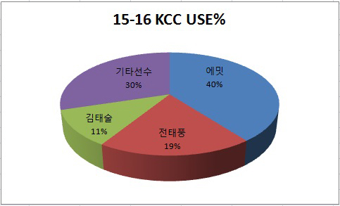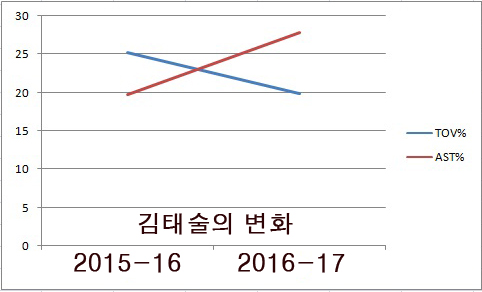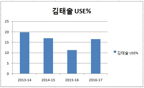 KGC에서 마지막 시즌이었던 2013-14시즌 김태술의 USE%는 19.8%였다. 리그평균이 16.1%임을 감안하면 공을 많이 만지는 편이었다. 그런데 에밋, 전태풍과 함께 뛴 2015-16에는 USE%가 11.3%에 그쳤다. 에밋의 USG%는 무려 39.6%로 KBL 역대 11위였다. 에밋이 혼자 북치고 장구 쳤다고 해도 과언이 아닌 셈. 전태풍 역시 USE%가 19.3%에 달했다. 두 선수가 볼점유의 60% 가까이를 차지하는 팀에서 김태술이 사실상 할 수 있는 플레이가 많지 않았다. 현재 김태술의 USE%는 16.5%로 예년 수준을 회복했다.