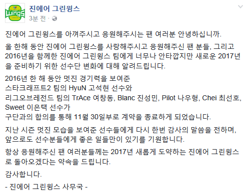 진에어는 30일 오전 공식 페이스북 페이지를 통해 리그오브레전드(이하 LoL) 팀 '트레이스' 여창동, '블랑' 진성민, '파일럿' 나우형, '체이' 최선호, '스위트' 이은택 등과 계약을 종료했다고 밝혔다. 스타크래프트2(이하 스타2) 종목에서는 고석현이 팀을 떠난다.
