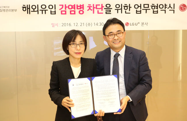 이를 위해 질병관리본부 곽숙영 감염병관리센터장과 LG유플러스 김규태 사업협력담당 및 관계자들이 참석한 가운데 LG유플러스 용산사옥에서 해외 감염병 정보교류 협약식을 맺었다. /what@osen.co.kr