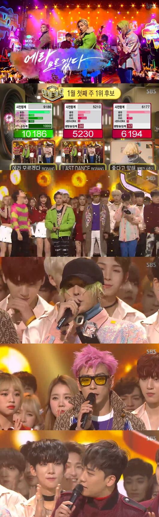 1일 방송된 SBS '인기가요'에서 빅뱅은 '에라 모르겠다' '라스트 댄스'를 나란히 1위 후보에 올리는 기염을 토했다. 12월의 음원차트를 집어삼킨 빅뱅의 연이은 활약.