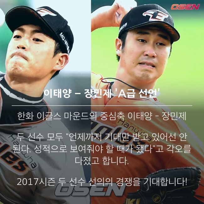 1990년생 동갑내기 이태양과 장민재는 다음 시즌에도 시즌에도 한화 마운드의 중심축으로 활약이 기대됩니다. 두 선수 모두 다음 시즌에는 '열심히 해서 A급이 되어보자'라고 결심했다고 합니다. 장민재 - 이태양은 "서로 선의의 라이벌로 경쟁하다보면 팀도, 개인도 더 강해질 수 있다"고 강조했습니다 2017시즌 이글스 마운드에 두 선수의 의기투합이 한화 큰 자산이 될 것 같습니다.