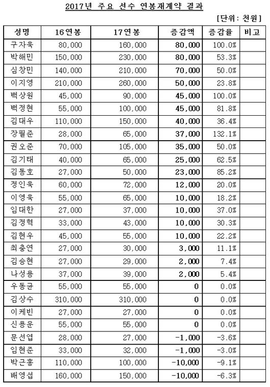 삼성 라이온즈가 19일 외야수 박해민을 마지막으로 FA를 제외한 2017년 재계약 대상자 40명과의 연봉 계약을 마무리했다.