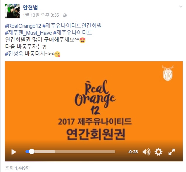 Real Orange 12(연간회원) 판매가 팬들의 많은 관심 속에 점차 열기를 띠고 있는 가운데 현재 태국 치앙마이에서 전지훈련을 소화 중인 제주 선수단도 직접 홍보에 나서 화제를 모으고 있다. 먼저 조성환 감독은 Real Orange 12(연간회원)의 판매 소식을 듣자마자 구입 의사를 밝혔고 판매 호조를 위한 독려 편지까지 보내왔다.